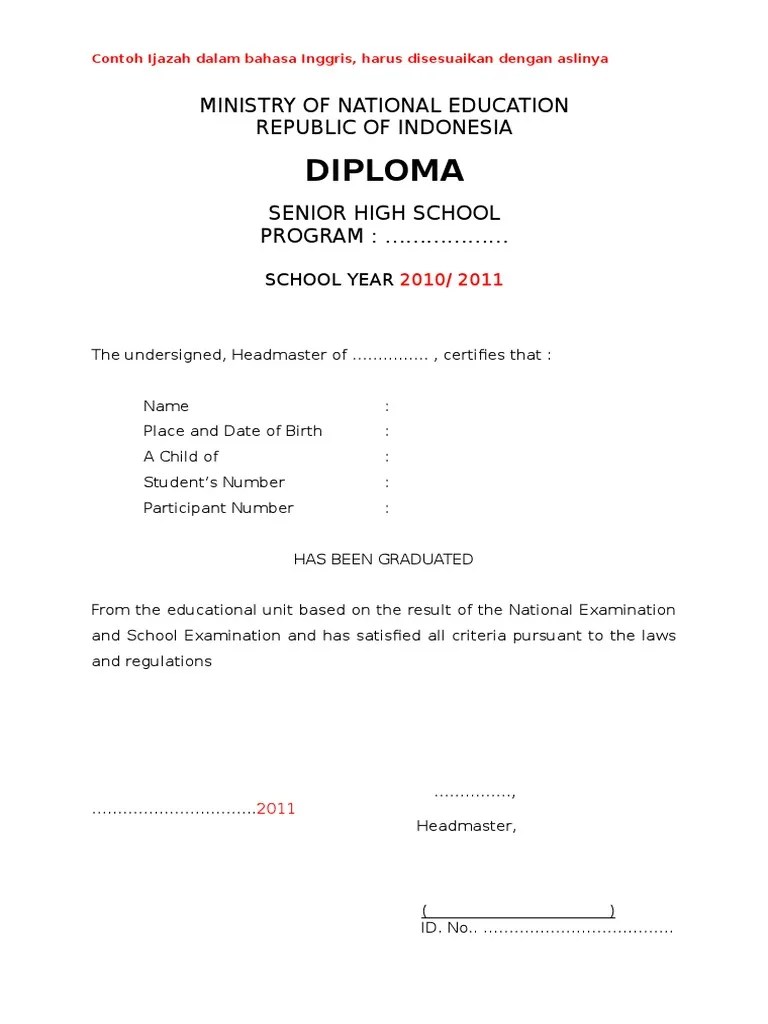Indonesia dan dapat diterjemahkan dalam bahasa inggris sesuai dengan ketentuan peraturan . · jika ijazah dan transkrip tidak dalam bahasa inggris, maka wajib menyertakan terjemahan . Pahami tata caranya terlebih dahulu! And with his only diploma,. Contoh ijazah dalam bahasa inggris, harus disesuaikan dengan aslinya. Ijazah, transkrip akademik, atau skpi ditulis dalam bahasa. Ijazah dan transkrip akademik (dalam bahasa inggris), jpg/pdf. Persyaratan · pindaian ijazah dan transkrip asli yang akan disetarakan; Surat keterangan pendamping ijazah (skpi) ini mengacu pada kerangka kualifikasi nasional. Translate ijazah dalam bahasa inggris. Dan saat ini saya dalam keadaan yang sehat dan dapat. Silahkan download syarat penerbitan translate ijazah & transkrip bahasa inggris berikut dibawah ini : Skpi diterbitkan dalam bahasa indonesia dan bahasa inggris.